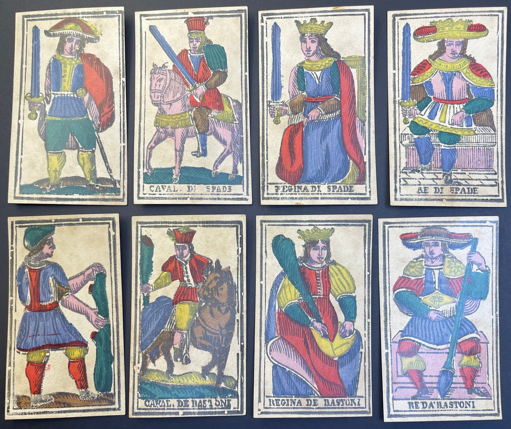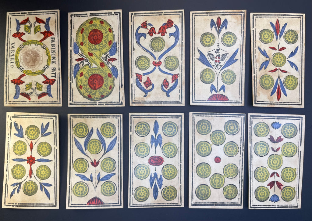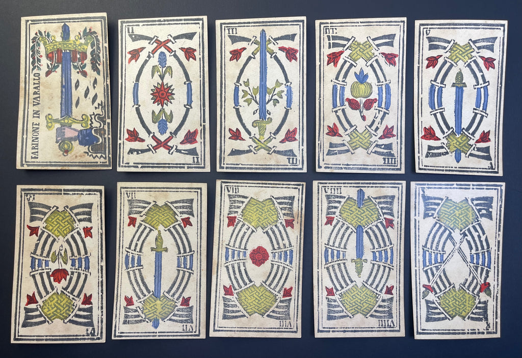· Cards: Ace of Cups with Farinone Batt In Varallo, two of Cups with Fabbrica di Farinone Batt in Varallo, Ace of Swords & Ace of Wands with Farinone in Varallo, & Farinone Batt Varallo and Regno d'Italia Centissimi 50 tax-stamp in use from 1883-1914 on Ace of Coins