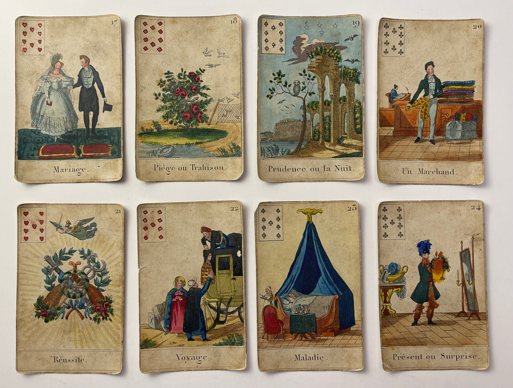 Le Livre du Destin is a French, 32-card fortune-telling deck. William Hughes Willshire (1876) describes an early c.1810-60 version of the game printed by Carpentier Mericourt and  held at the British Museum (1866,1110.647-679) as:A pique set of cards of the suits piques, coeurs, carreaux, and trefles (spades, hearts, diamonds, and clubs). It is intended for the purposes of fortune-telling as well as for ordinary play, but belongs to the amusing variety of fortune-telling cards, and not to the serious divinatory class.