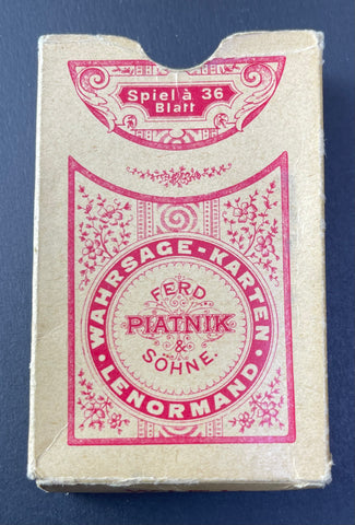 Description: "There is a traditional order for the designs in a standard Lenormand fortune-telling pack, starting with a male rider on card 1. However, in this pack from Piatnik dating from c1960 according to Jensen¹, the order is different, with a man in a top hat and carrying a cane on card 1 – the same image as appears on card 28 in a modern pack. Cards 1 to 4 are the four Aces, followed by the remaining cards in strict order (K, Q, J, 10, 9, 8, 7, 6 on cards 5 to 12, etc.), whereas in a modern pack the suits are jumbled up. The maker’s name appears in full on cards 1 and 3, as it does on cards 25 and 28 in a modern pack. The maker’s initials (FPS) appear in the top right-hand corner of every card (as they do in a modern pack), and twice on cards 3 and 18." World of Playing Cards, 2023