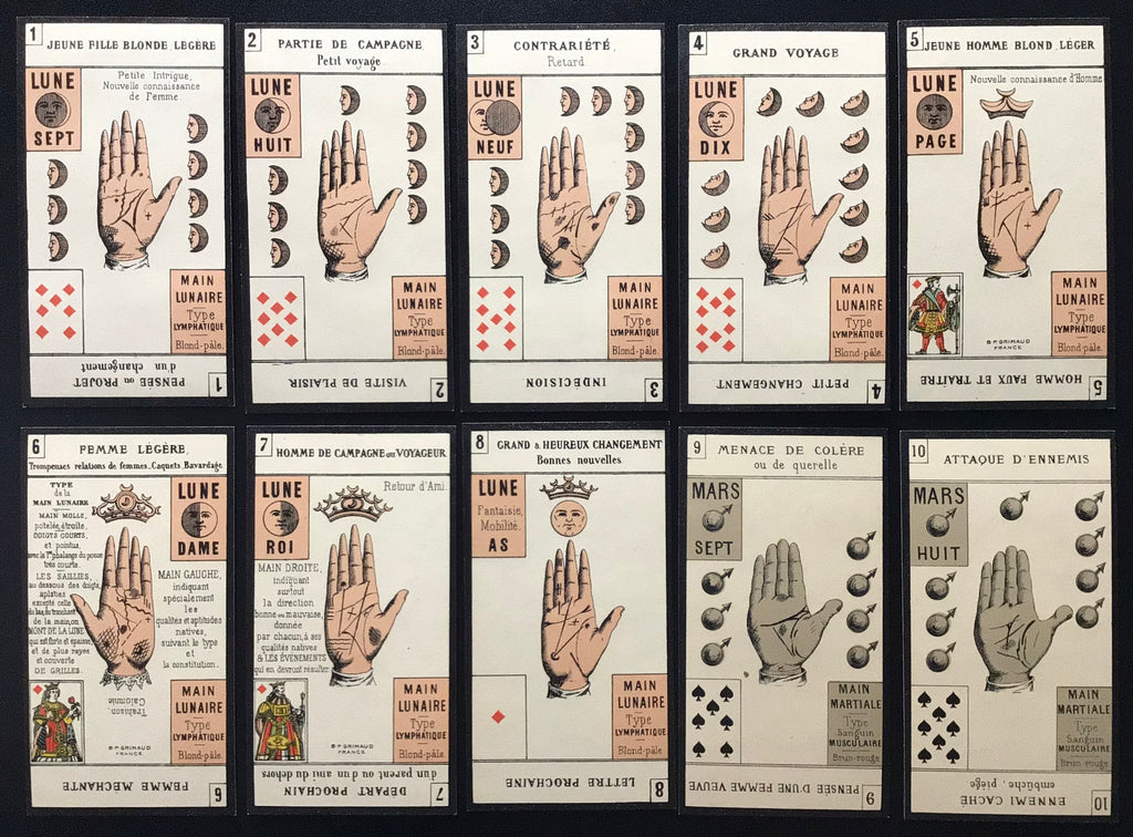 Antique Parisian palmistry cards, following the designs of the mid 19th century by Adele Moreau this deck was printed by B. P. Grimaud of Paris, in France, sometime between 1930 and 1935. Complete 56/56 cards with booklet, no box.