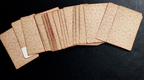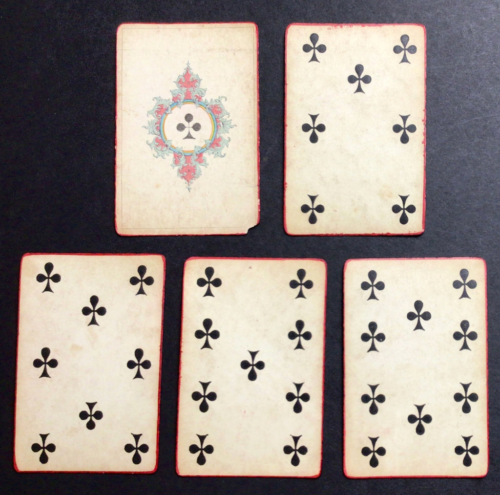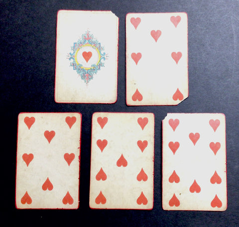 DESCRIPTION: One of Daveluy's earliest packs, the "Première Croisade," is here presented as a piquet deck with 32 cards (of the original 52 cards?), consisting of a King, Queen, and Jack, as well as the Ace, 7, 8, 9 and 10 for each suit. The red border around the cards appears to be painted by the hand of a previous owner.