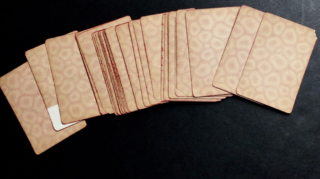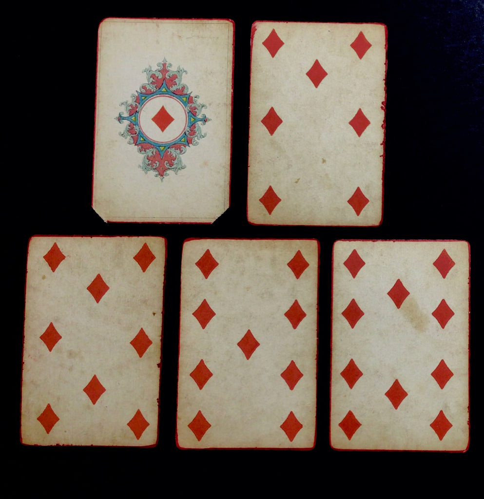 CONDITION: good condition, with some corners clipped, creased, and ripped; some chips, creases, and tears along edges; general wear, staining, and patina; Queen of Diamonds with large tape repair of rip. See photographs for further details