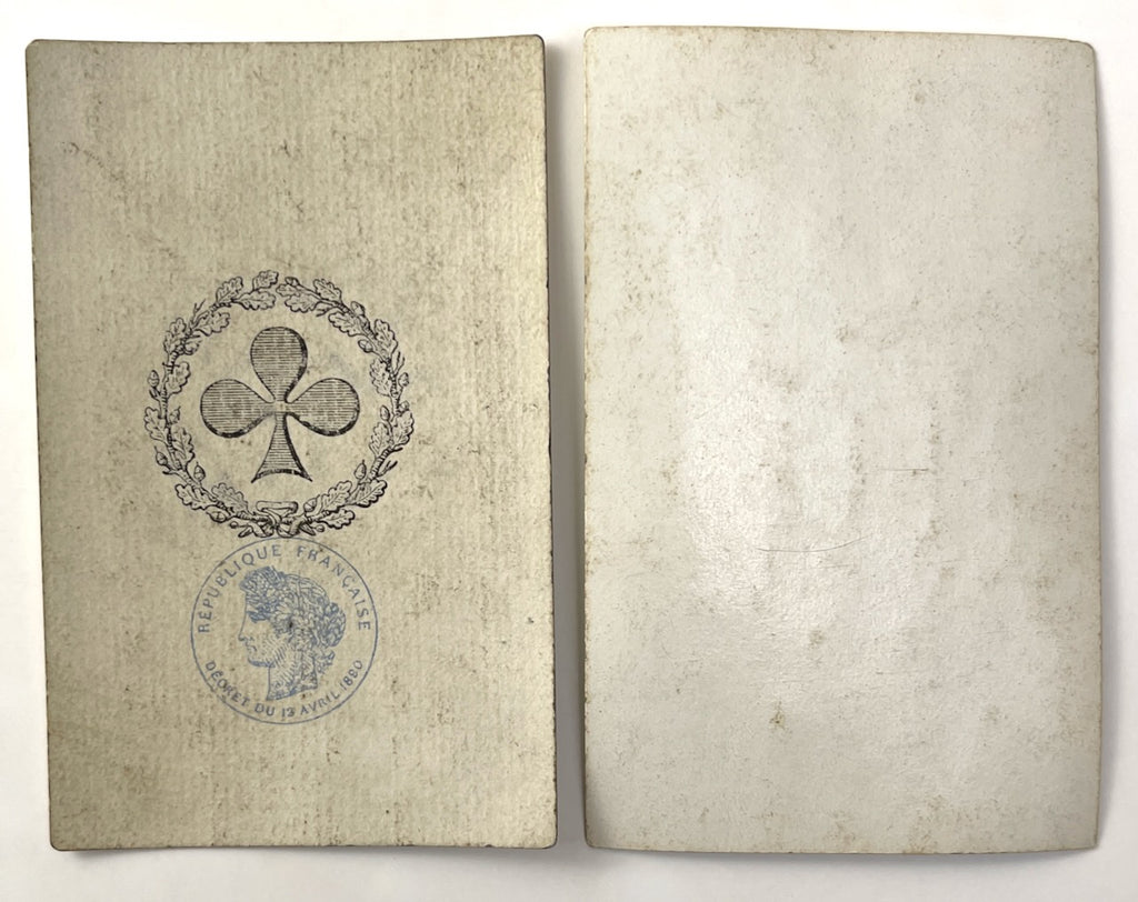 · Cards: "GATTEAUX" in very small print & "ADMINIST. DES CONTRIB. INDIR. 1850" on the Jack of Clubs shield; oak wreath on Ace of Clubs (w/ Republique Francais Avril 12, 1890 tax-stamp); names on all of the court cards.