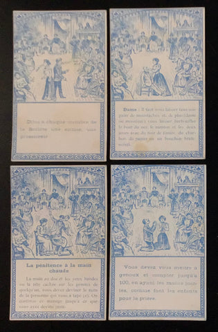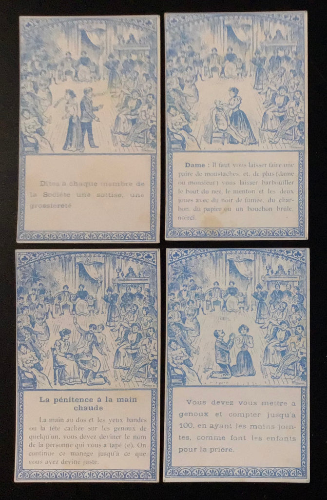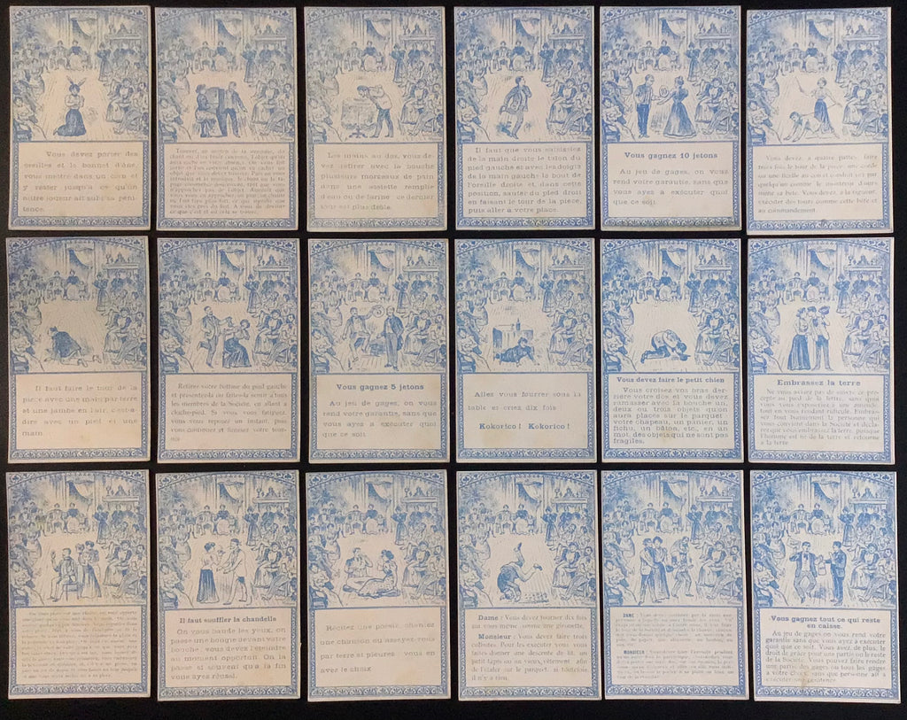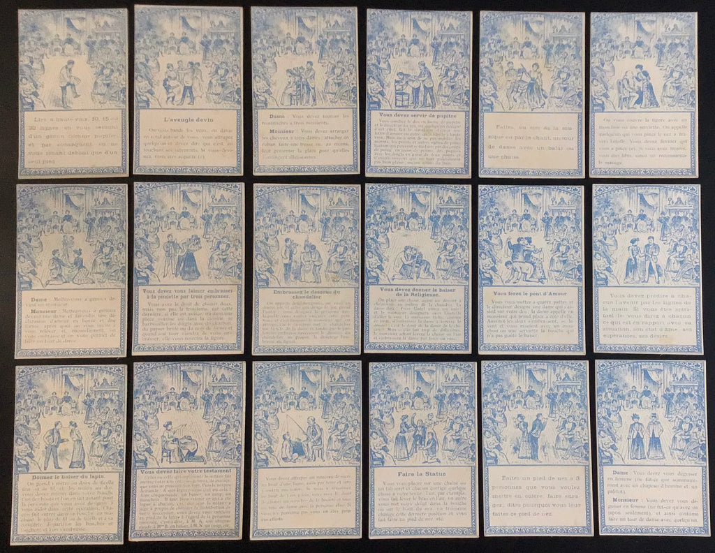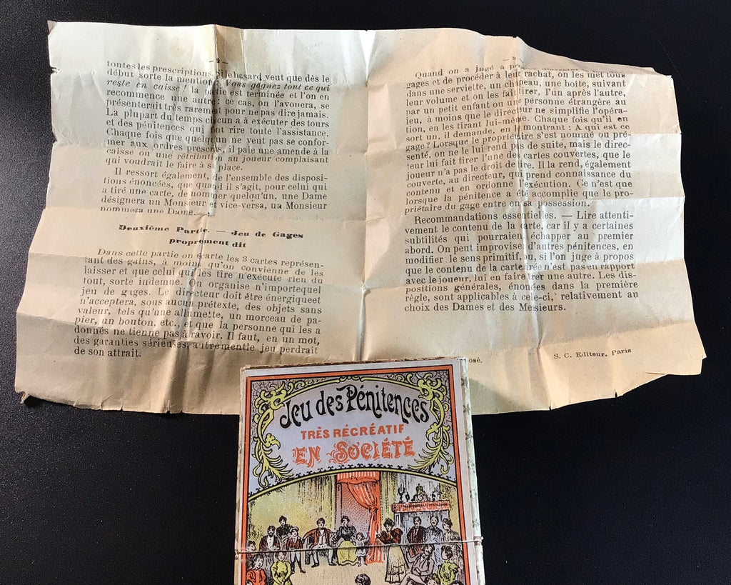 Description:  Antique c.19th-century party game by Simonin-Cuny. A bit like the game "Truth or Dare," without the "truth," le Jeu de Pénitences (Game of Penances) includes 40 cards which instruct you to perform specific tasks designed to embarrass and amuse. Examples of the tasks include completing a dance with a broom or chair, taking off your left shoe and hopping on one foot as you make all partygoers smell your shoe, and sitting on the floor while reciting a poem or singing a song, all while crying. Bring this antique to your next social gathering and party like it's 1899!