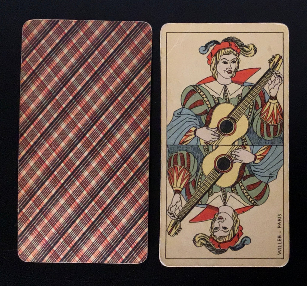 Description: A tarot deck from Éditions Willeb, with 78 cards. Major Arcana with no titles, and Minor arcana without indices. This is a Bourgeois or Tarot Nouveau-styled deck, with unusual depictions for the atouts. Éditions Willeb were book and game publishers that began work in the 1930s in Paris. Along with books, they published children's toys, games, as well as cards and tarot decks.