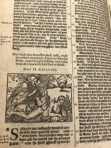 The first woodcut signed P.B. is by Peter van der Borcht, a famous artist, etcher, and draughtsman who worked for Christopher Plantin. The rest of the woodcuts are mostly after Sebald Beham's 1533 designs, first published in his Biblisch Historien. Beham is counted among the best of the "Little Masters" or "Kleinmeister," a group of German printmakers "so named because of the small size of their plates"(Griffiths 1996, 42) and the detailed nature of their work. These Benham designs illustrated numerous Bibles throughout the 16th and 17th centuries, including the 1535 Coverdale Bible.