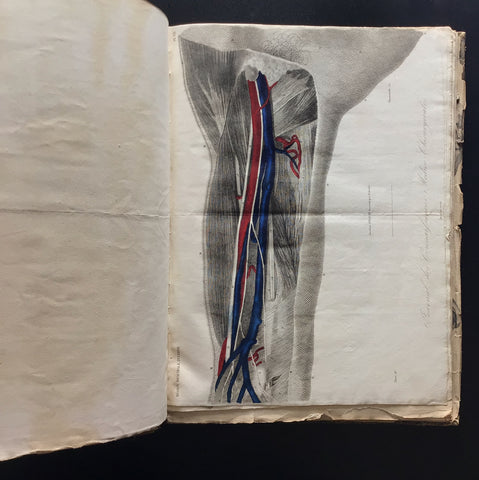This is an interesting collection of 47 anatomical plates (some coloured) from the Journal des Connaissances Médico-Chirurgicales. Paris, c.1830-60. In Folio. Most plates are numbered with titles, but the numbering is not sequential. The plates were gathered from various sources and bound for specific use in the study of anatomy or surgery. They likely served as a quick anatomical reference. There are 47 plates, all anatomical diagrams of various human parts, including the heart, eyes, skull, neck, chest, leg, and male genitals. Twenty of the 47 plates are coloured.