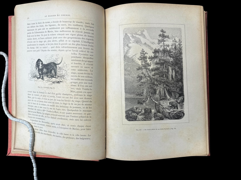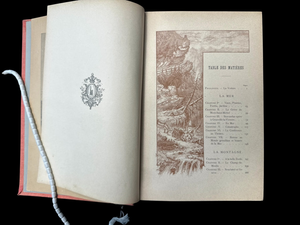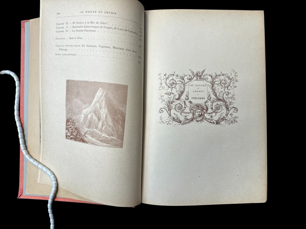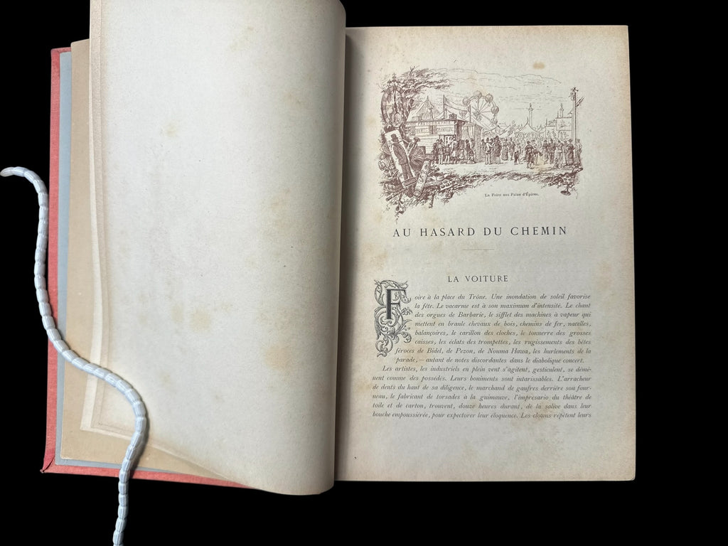 Meunier (Stanislas), M. et Mme. Au Hasard du Chemin. France: J. Rothschild, ND (c.1900). Bound in red cloth with gold gilt title on decorated spine, and gilt fore-edge; Large octavo, pp.384; Title page printed in red and black; 666 black and white illustrations, along with 20 full colour chromolithograph plates, hors-texte.