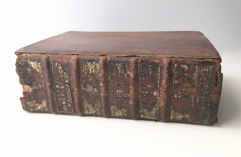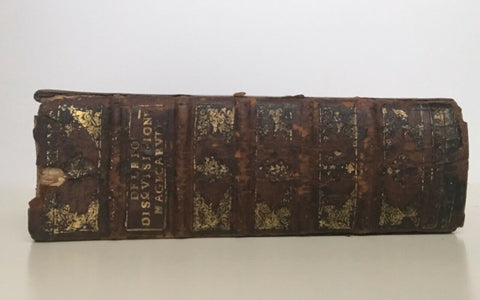 Very rare 1599/1600 editions of Martino Del Rio’s Disquisitionum Magicarum in three volumes bound as one in original full calf leather binding. The spine is gilt decorated with 5 raised bands and a red gilt lettered morocco label. Separate title pages with engraved vignettes mark the beginning of each of the three volumes.Volume 1 is dated to 1599, while volumes 2 and 3 are dated to 1600. At the end of volume 1 is an errata leaf with the colophon on the verso dated 1599. There is a fold-out table in volume 2, which appears to be concerned with divination and auspicious signs/symbols and provides reference to other texts.