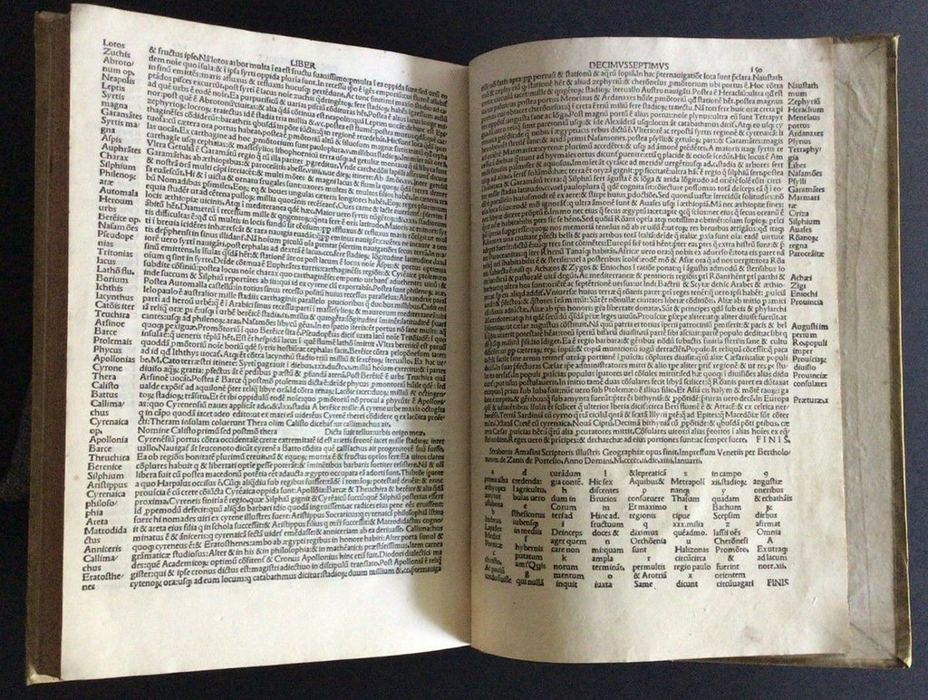 Rare post-incunable 1502 sixth edition of Strabo’s Geographica, translated to Latin as De Situ Orbis by Guarino da Verona and Gregorio Tifernate. The text contains woodcut initials and a table of names and subjects housed in full vellum Italian binding of the 18th century. Imprint from colophon. Edited by Antonio Mancinelli (as appears in the preface dated 1494).