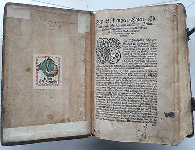 The text illustrations include depictions of historical events, portraits and coats of arms of the city-based nobility and citizenship, with the corresponding colors being marked by letters for the first time. Printed in German Gothic script. Tooled metal clasps. Spine with four raised cords. Embellished with dainty engraved capitals & end-pieces. Delightful ex-libris bookplate.