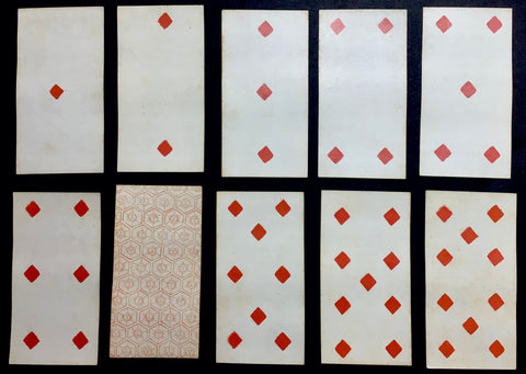 The IPCS Pattern sheet indicates that "it seems never to have been known in a shortened, 54-card, form." This tarot deck was, thus, likely shortened to 52 cards in order to play a game such as whist, and along with the 22 trumps and four Jacks, the 7 of Diamonds is now missing as well (51/78).