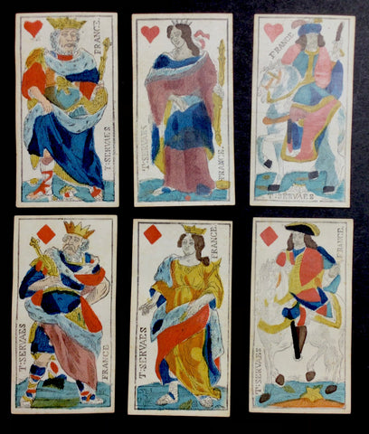 T. Servaes was a Belgian cardmaker active in the last quarter of the 18th century. The marker of "France" on the cards indicates the deck was made after 1794 when France annexed the South Netherlands. The Servaes factory was closed by 1803.