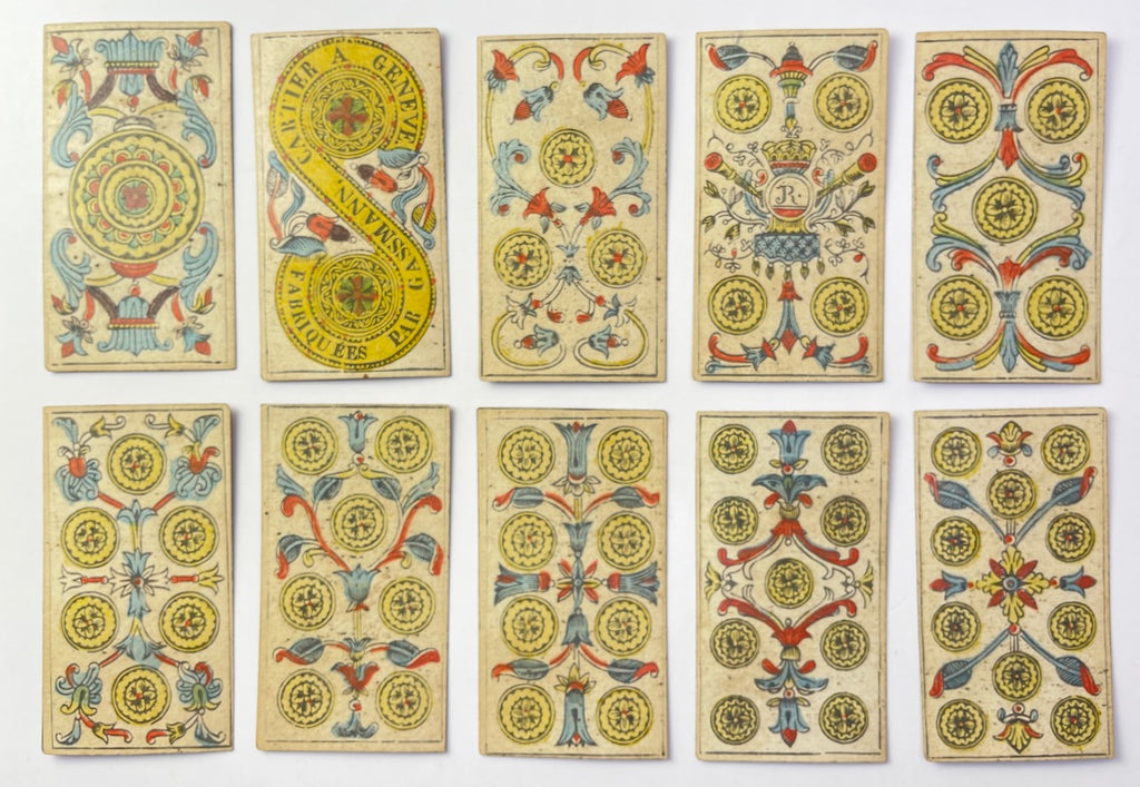 Description: François Gassman, Tarot de Marseille, Type II, Geneva, Switzerland, c.1840-70, 78 of 78 cards, woodblock printed and stencil painted. The Major Arcana and courts are full-length figures; cards with French titles, Roman numerals, Italian suits and square corners. The 2 of coins reads, "Fabriquees Par Gassmann, Cartier A Geneve."