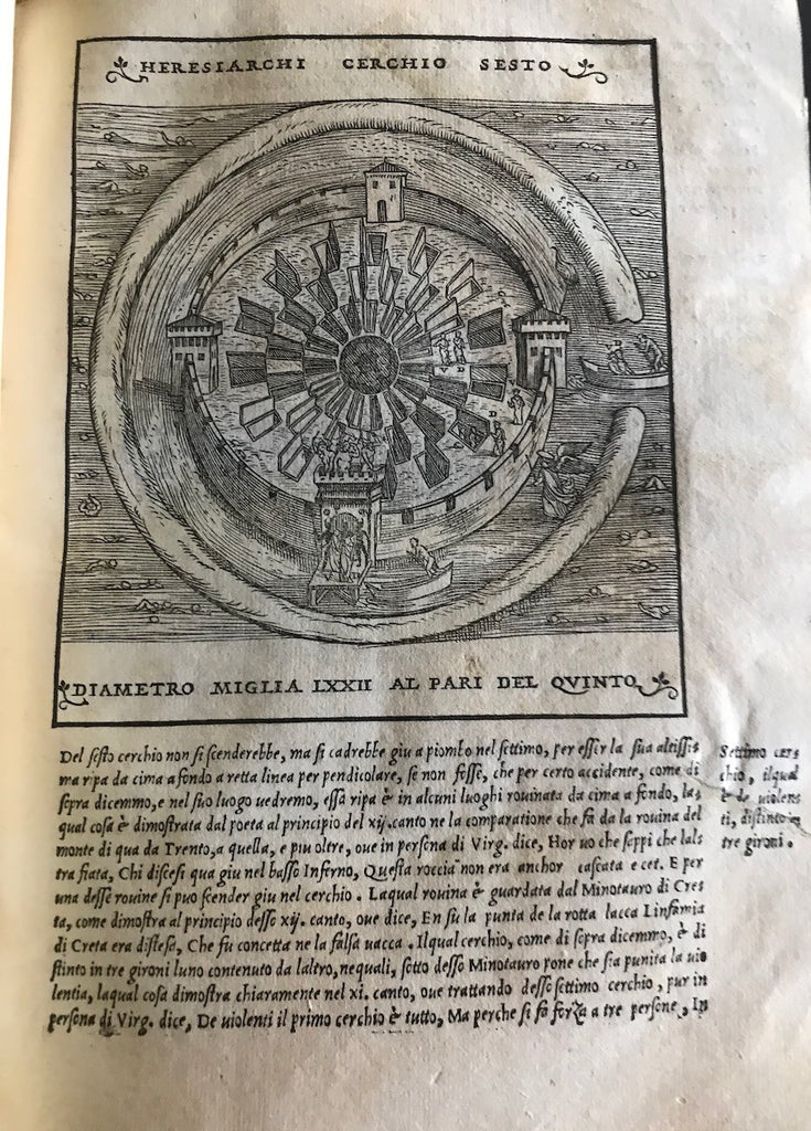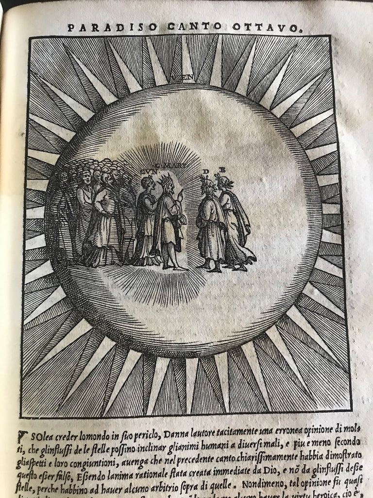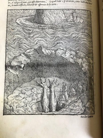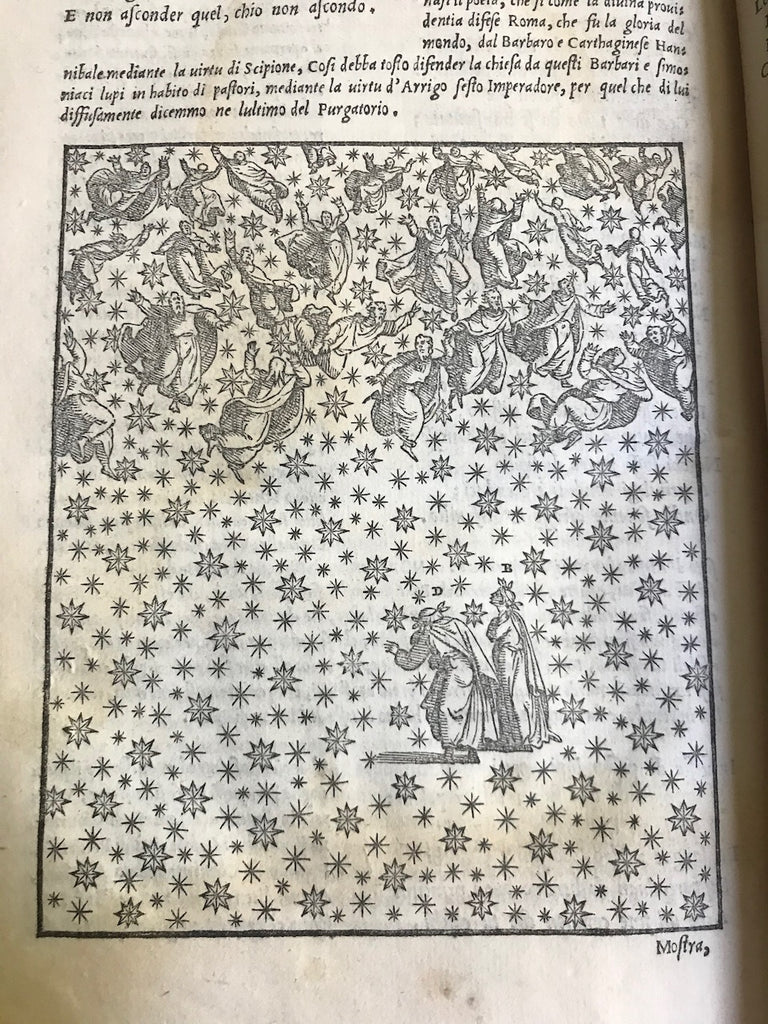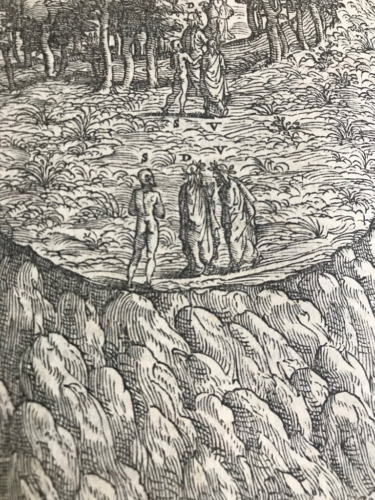 The first new commentary published in the 16th century, Vellutello's work challenged previous interpretations of the poem and is known for its "bold criticism of the previous scholarly tradition" (Alvarez). He was particularly concerned with elucidating Dante's historical and literary allusions, clarifying the material for his contemporary audience (Lansing, 850). The commentary and woodcuts, printed for the first time in the 1544 edition, were created for this printing and were later recycled throughout the 16th and 17th centuries.