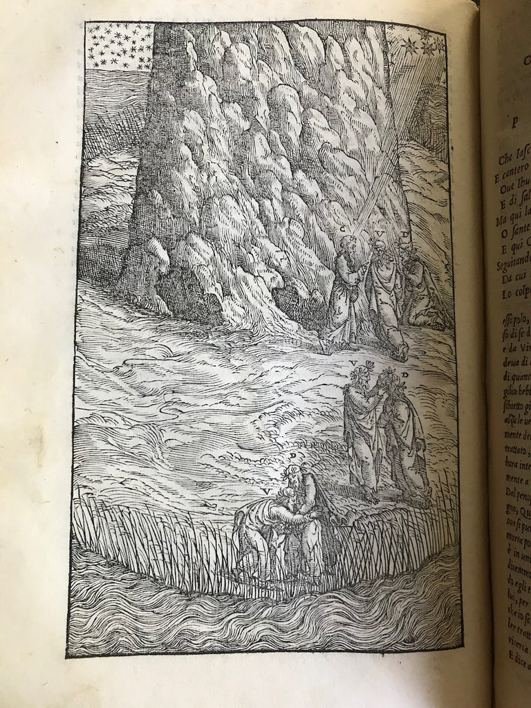 First edition, 1544 printing of Dante Alighieri’s Divina Commedia (Divine Comedy) with commentary by Alessandro Vellutello, printed by Francesco Marcolini, including three full-page and 84 woodcuts, bound in full vellum of the 18th century. A few capital spaces with guide letters. The text is printed in columns, irregularly disposed, with the commentary printed in smaller type around the main text. The first 26 leaves contain a dedication to Pope Paul III, etc. There are a total of 87 woodcuts, with 2 repetitions. Three full-page woodcuts illustrate the beginning of each book (Inferno, Purgatorio, and Paradiso). Due to a print error, this edition is missing lines in Purgatorio II, 64-66 (leaf V7 recto), which have been added by hand.