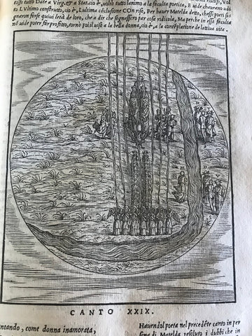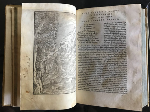 CONDITION: Internally in very good condition. There are small restorations on the title page and on three other leaves with no loss of text. Some pages are browned. Some water stains found mostly on the first leaves and on the last part of "Canto of Paradise." Very light soiling of vellum, with stain mark on front cover, and vellum chipped at middle thread of front cover and small, one-inch chip of outer edge of back cover. Light wearing of vellum at corner boards. Pencil writing inside on front blank. Soiling and water stain on front page with signs of repairs. Water stain on first front pages, with age darkening and repairs. Age darkening of Prima Canta frontis engraving, and very light soiling and age darkening throughout. Yellowing of Purgatorio at the end of Canto Octavo and beginning of Canto Nono. This ends at Canto Decimo. Also occurring at several other portions, including Purgatorio in middle of Canto 30, Paradiso Canto Second and Octavo. Old repair of marginal tear on second page of Canto Nono. As well as yellowing occurring throughout Paradiso. Water stain affects the upper most portion of Paradiso. Age darkening of the last pages of the book Paradiso from Canto 32 to 33 and last page with printer's imprint, one page with minor repair. Lacking last leaf blank. The missing lines in Purgatorio II, 64-66 (leaf V7 recto) have been added by hand.