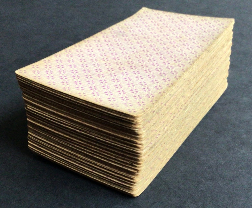 · Reverses: intricate circle and "cross"/"petal" pattern in two different shades of purple.