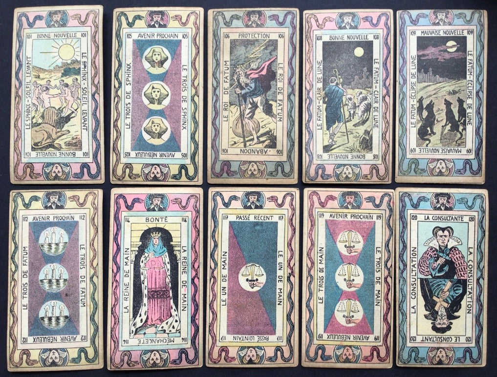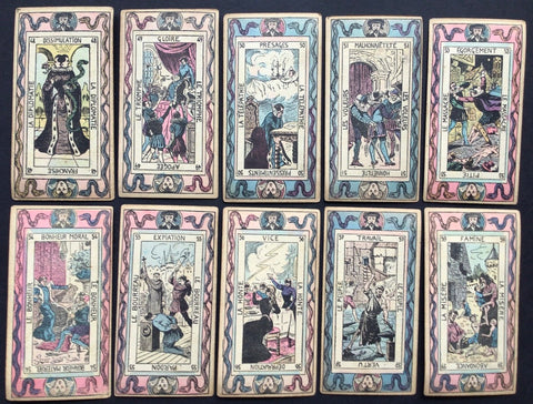 Description: This is an incredibly scarce deck with a unique design. The original deck consisted of a total of 120 cards, the example for sale is missing 40. The cards were illustrated by Henry Steimer. "Steimer was an early French comic artist. He appeared in numerous publications of the 1910s and 1920s," including illustrations for the 1904 French edition of Sir Arthur Conan Doyle's novel, Uncle Bernac, published as Le Roman d'une jeune fille. The booklet originally accompanying the deck has a foreword by Maurice Lanra. On the front of the booklet, the name "Maguelone" is found at the very top.